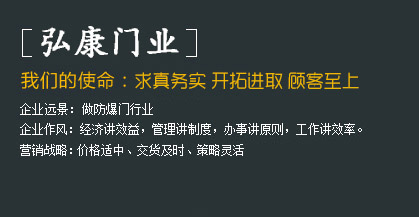河北弘康門(mén)業(yè)有限公司     河北弘康門(mén)業(yè)有限公司是一家生產(chǎn)防爆門(mén)窗、泄爆門(mén)窗、密閉門(mén)窗、防火門(mén)窗、監(jiān)獄門(mén)、隔音門(mén)、變壓器門(mén),隧道抗風(fēng)壓防火門(mén),隧道防護(hù)門(mén),3小時(shí)防火門(mén)窗,防火玻璃門(mén),雙向開(kāi)啟防火門(mén)等特種門(mén)窗的生產(chǎn)廠家。河北弘康門(mén)業(yè)有限公司一直致力于防爆技術(shù)、新產(chǎn)品的研究開(kāi)發(fā)工作。